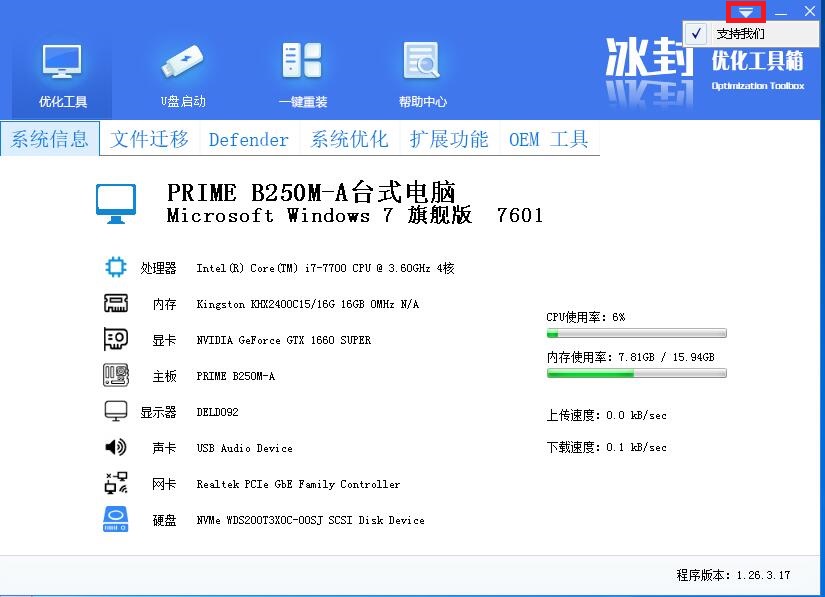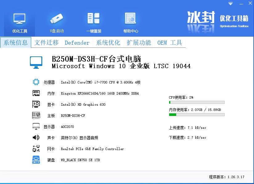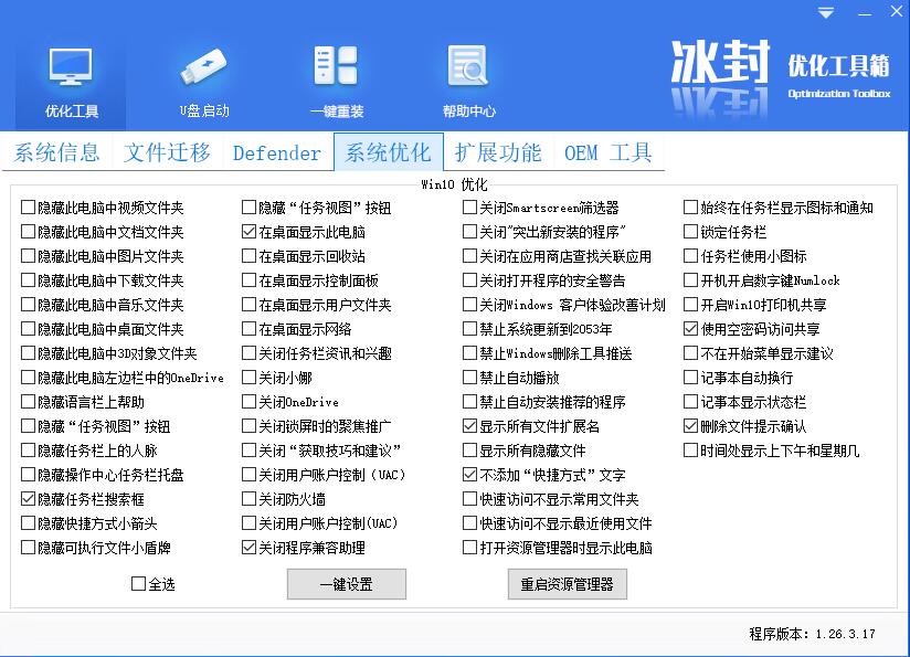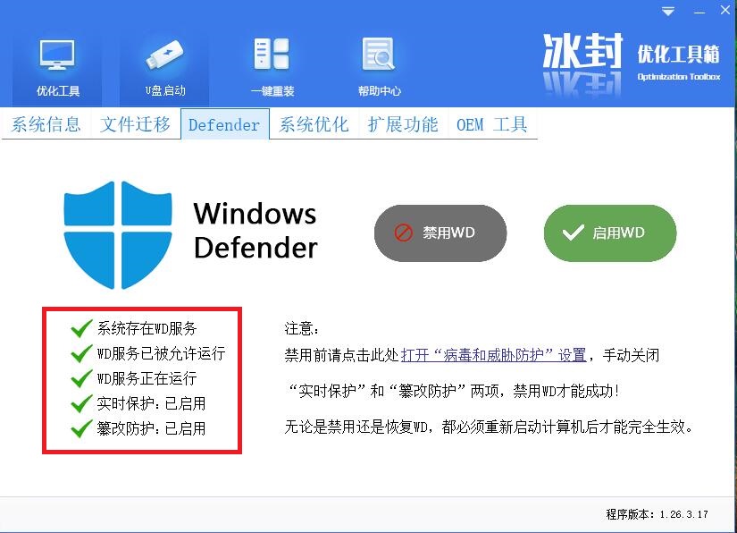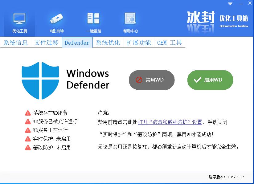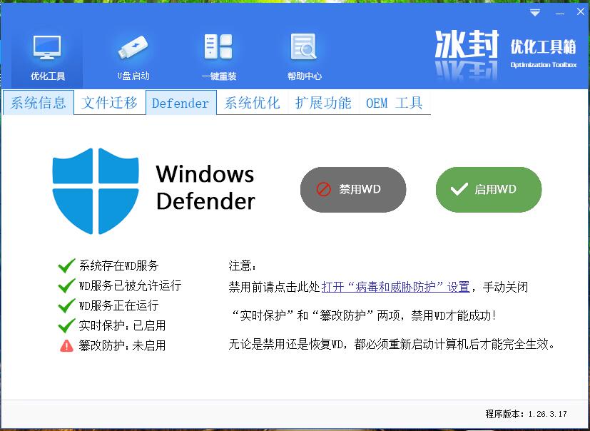 打开冰封优化工具 defender功能正常显示