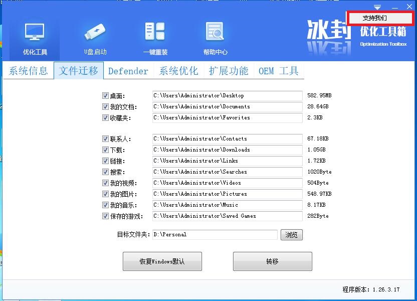 使用方法:可以把C盘常见的资料转移到其他盘 一般点转移就可以了
